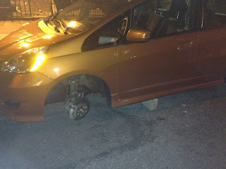 Between the hours of 4:00 and 5:00 PM on a Saturday afternoon, what must have the ghetto equivalent of the NASCAR pit crew hoisted my neighbors car on blocks and removed his wheels without a single person noticing.